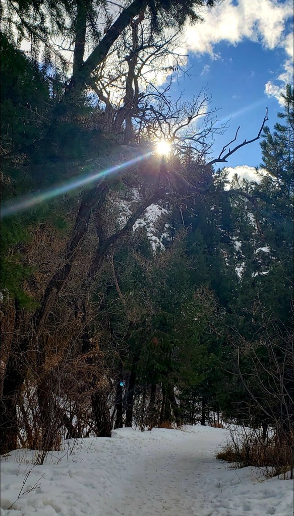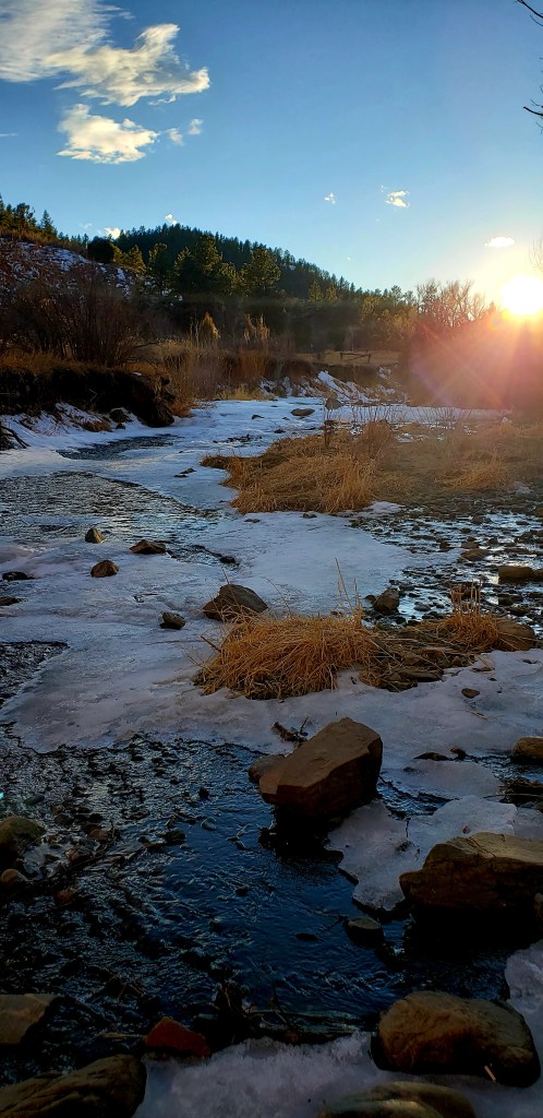 I ventured out to the foothills early the following week after work, when we were having the typical warm before the next storm system moving in. Heading up, the road follows the river and I’ll admit I was a little disheartened that the river was completely snow covered. More than once I thought about turning around, heading home and saving my river visit for the spring. My stubborn streak wouldn’t let me call off my plan, and further west I went. I smiled as I drove through Idledale, remembering parking at the post office to watch the blood moon a few years back. I waved at an elderly man who was walking his old lab, both walking at the same pace in a comfortable rhythm. I wouldn’t quite call it a sleepy town, but it’s close.