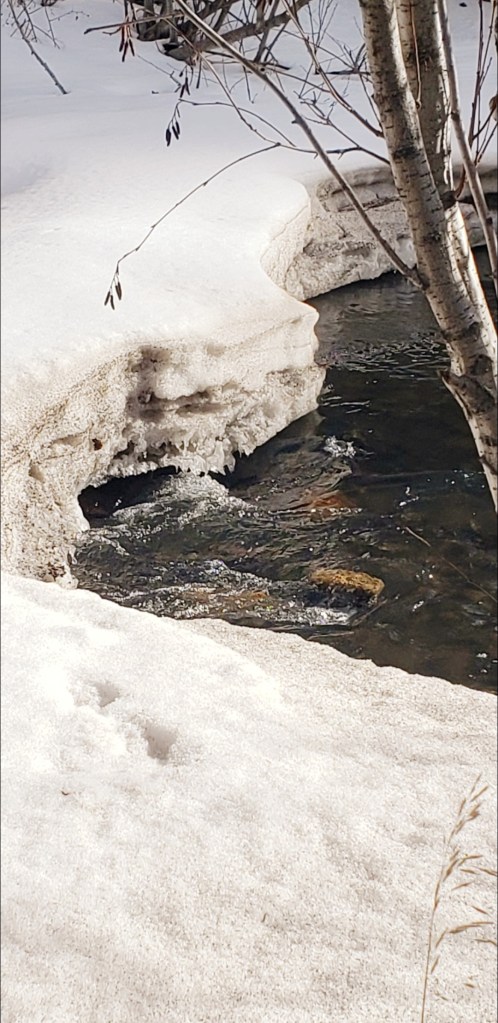 The trees were brown but no longer coated in a layer of snow, and if you looked closely, there was a hint of green on the branches once again. The underbrush was mostly covered still, except for places that spent most of their days getting warmed by the sun. I veered off the main trail to go down by a little eddy, and I was pleased to be able to see the river in spots. A little grey bird flew down and landed atop the snow, perched right near the edge, looking down at the river as well. I nodded to them, and continued on my path.