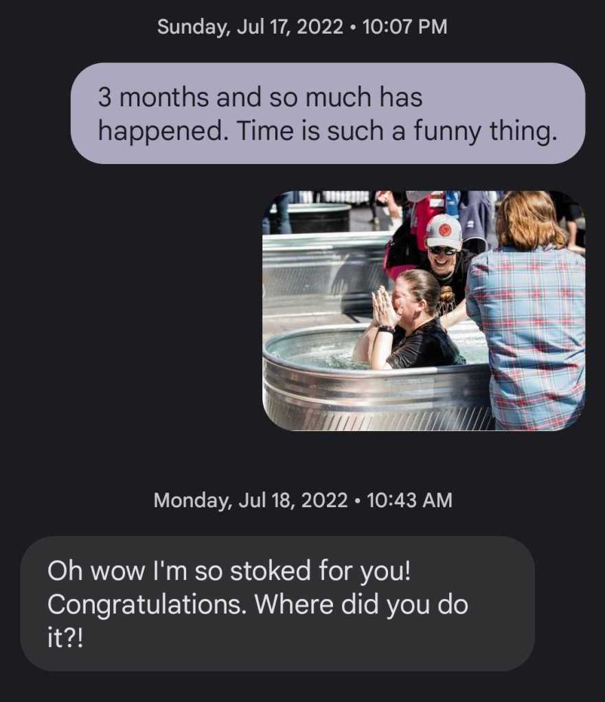 I did share with my best friend on the other side of the mountains, a day or two later, with a picture of me in the water. All I said was “I know you’ll understand.” and she did. It was an honor to walk into my church with her together when she came over to visit, after she’d been praying for me for upwards of 20 years.